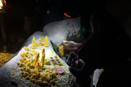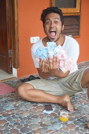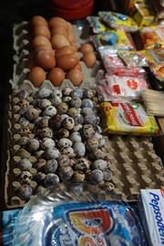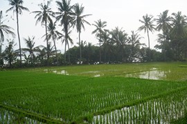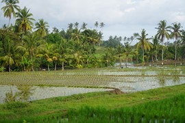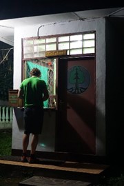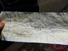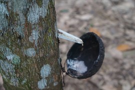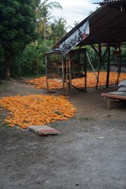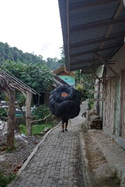 To harvest the rubber, the farmers cut open a slice of bark on the tree and set a coconut shell underneath where the latex sap drips out. They collect the shells once a week (Fridays on this plantation) to carry down to the market to sell to the processing factories for a mere 6,000 IDR per kilo (about USD $0.25 per lb.)