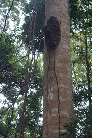 During our trek, Chandra and Leli (AKA – “Jungle Boy” and “Mowgli” – their nicknames, not ours!) showed off their extensive knowledge of the jungle, pointing out Giant Forest Ants (only the males would bite Leli when provoked) and termite nests in trees (through they eat wood, they wisely don’t eat the tree that supports their home). Yeah, yeah, very nice…WHERE ARE THE ORANGUTANS?!?!?