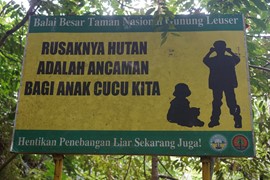 In addition to bilingual wildlife guidelines for tourists, signs at the park entrance implore locals to stop illegal logging to protect the rainforest for future generations.