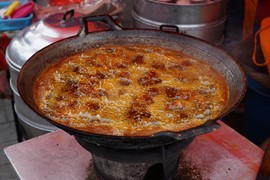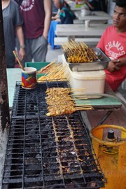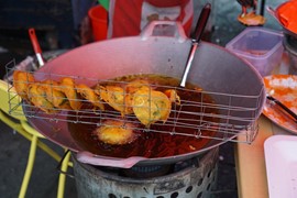 Fryers cooking up chicken and dumplings in the Tanah Rata food market