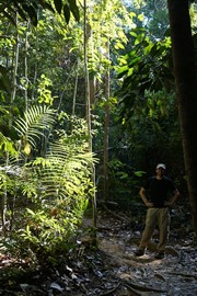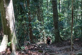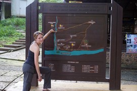Once at the top, we had to decide how to get down – should we return the way we came? A bit boring, but we hadn’t really planned to do a large hike after the canopy walk. Or, should we continue down the trail and see if it was a loop? We had a map with us – unfortunately it was a map of the entire Taman Negara Park. Given that it is the largest park in Malaysia (at 2500 square KM, its name literally translates to “*The* National Park”), our little 2KM trail was a very tiny section and hard to read. In the end we decided it was very early in the day to just turn back – surely the path is a loop! – so we continued down the trail on the other side of the hill.