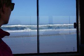 After the kayaking trip, we headed north a mere 35KM to the next town of Swakopmund. Our guesthouse was a short walk into town, so we explored on foot a bit – checking out the beachside restaurants, craft market, and lighthouse – and watched the sunset on the pier. We’ve been wine-ing & dining almost every night in Africa so far, so we decided to pick up the car and grab some take-out to eat in our cozy hotel room.