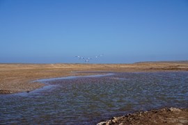 Flamingos feeding along the coast