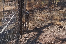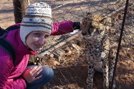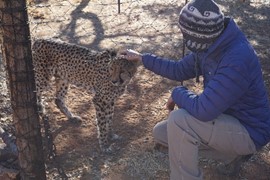The fourth tame cheetah is an old girl at 17, and is a bit too grumpy most days to entertain hordes of tourists at the main farmhouse, so she has a private enclosure near the cabins. We are allowed to pet her through the fence as long as she is willing.