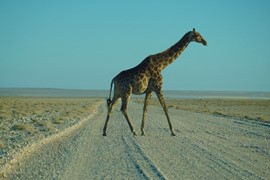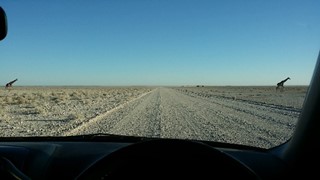 7AM in Etosha National Park – a small herd of giraffes cross the road just ahead of us