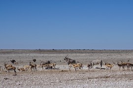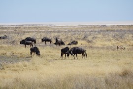 Our first waterhole of the morning is on the edge of the salt pan – where a large herd of wildebeest are chowing down on grass and butting a few heads