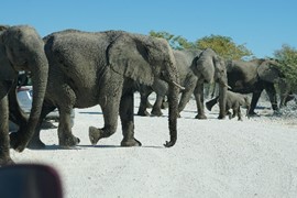 We start to drive away from the waterhole, only the realize that the road out is also directly in the path of the elephant parade! Oh boy, here they all come!
