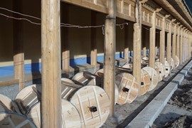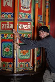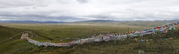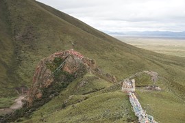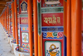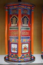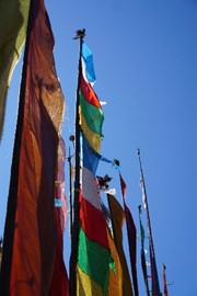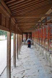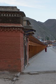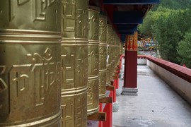 Tibetan prayer flags and prayer wheels at the Zharu Temple