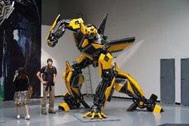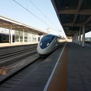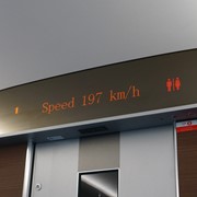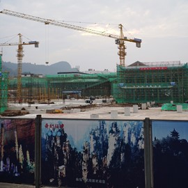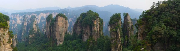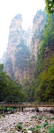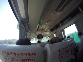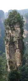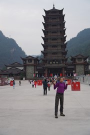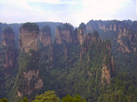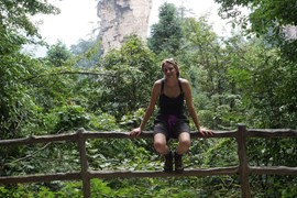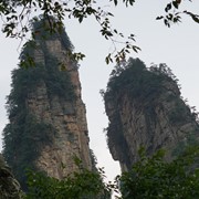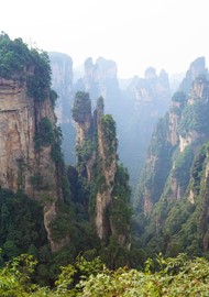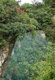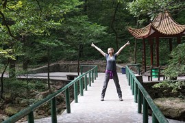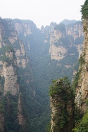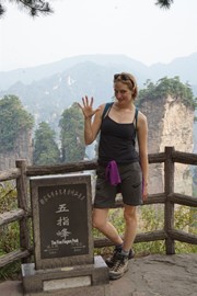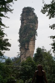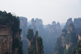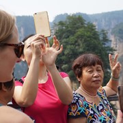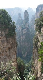There is no line for the shuttle bus, so we hop right on and speed off toward the Rize Valley. While a Chinese guide talks nonstop in her mic, Lindsay notices the TV monitor is playing a video of the park highlights with English captions – she soon realizes that the video is perfectly timed to describe the attractions as we pass them – nice!