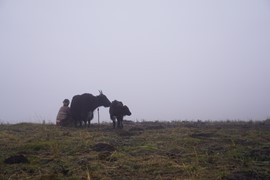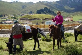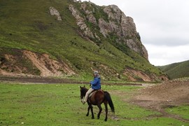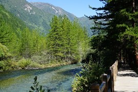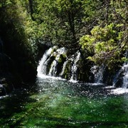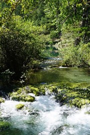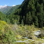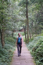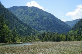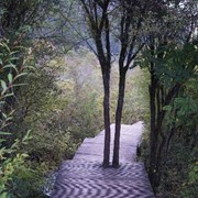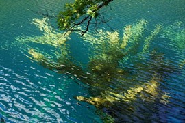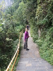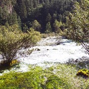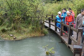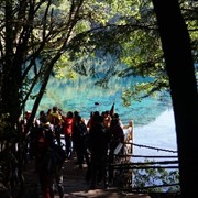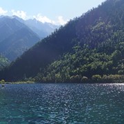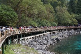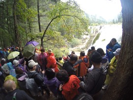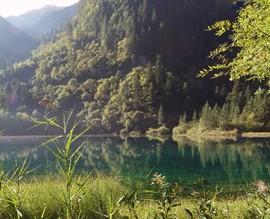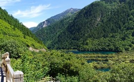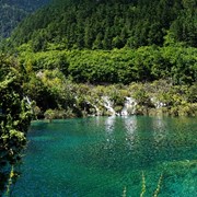 Crystal-clear and sparklingly blue, the Rhinoceros and Tiger Lakes are fabled to have healing powers. As we pass the Shuzheng Waterfalls, our path takes us out of the heat of the sun and into the woods