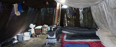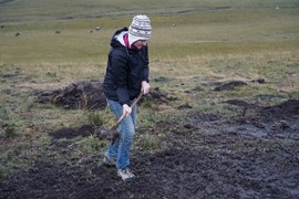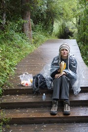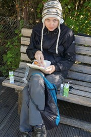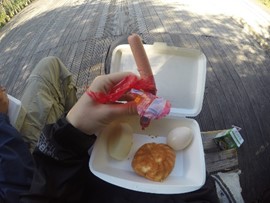 We find a quiet spot near the closed section of the trail to have our packed breakfast