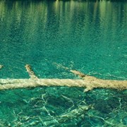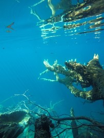 A skeletal dead tree in the water looks like coral in the freshwater lake
