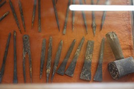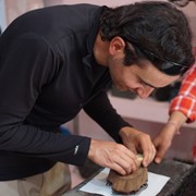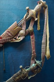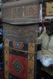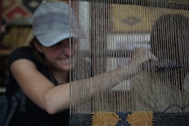 A weaver sits behind a giant wooden loom and expertly threads different colored wool threads into the loom, then flattens them with a metal comb, creating a beautiful pattern – when he noticed Igor and Lindsay admiring his work, invites each of us to give it a try!