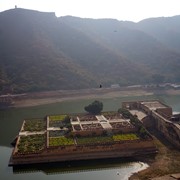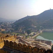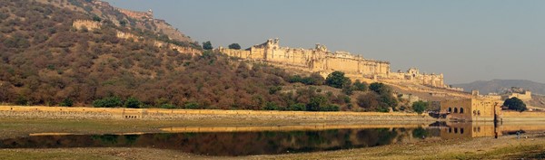 The Amer Fort – the ancient capital of the Jaipur maharajas – sits on a hill above Lake Maota