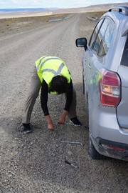 We were *so excited* to finally reach the paved road of Ruta 40 – we’ve been driving on gravel road almost constantly since Day 2 of the Carretera Austral, and we been very cautious to make sure we didn’t get a flat tire. According to Lonely Planet, Ruta 40 is, like, 90% paved…oh, except for a 115KM stretch between Gobernador Gregores and Tres Lagos. Igor was at the wheel, since our Argentinean permit only allowed one driver, and even though he was going a respectable 60KMPH we started to hear an all-too-familiar thwump, thwump, thwump, out our window. We pulled over, and sure enough, he discovered we had a flat tire.