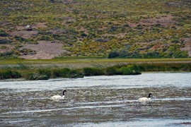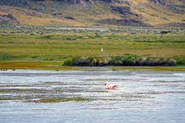 A variety of birds – geese and flamingos – populate the marshy ponds