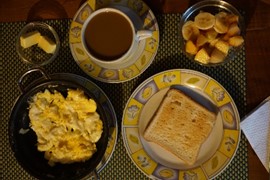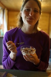 Lindsay is overjoyed by the breakfast spread: hot coffee and muesli!