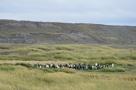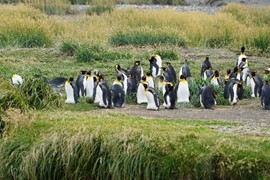 There are about 50 King Penguins on the beach and in the grasses – some are molting, and some a sitting on eggs. The park has several ongoing population studies, and we can see that many of the birds have tags on their wings, and one even has a radio glued to its back