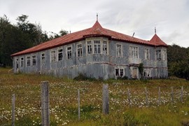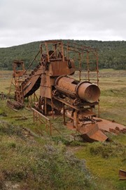 “The Draga Aurífera: It is actually a vestige of the origin of the settlement of the island. It was brought over during the gold rush. This machine performed the mechanical shovel work for the removal of dirt in the work of gold extraction. It came from England in 1904 and ran until 1910.”