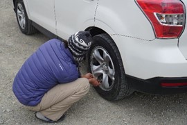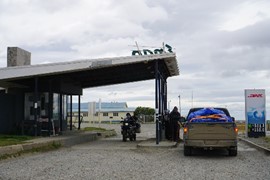 We stop for gas at the (supposedly) southern-most gas station in Chile at Cerro Sombrero – Igor tries to proactively reduce the risk of another flat tire by letting out some air (thereby increasing the surface area of the tire)