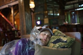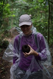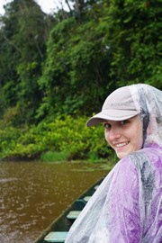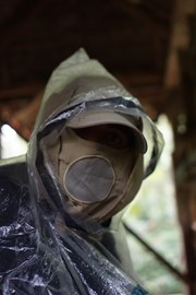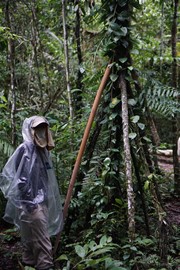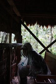 Even though it stopped raiing, Igor keeps his poncho on as an extra layer of protection from the mosquitos