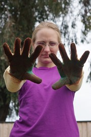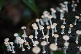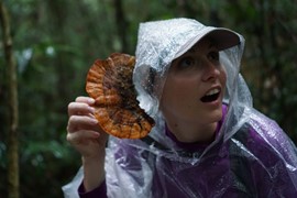 Fun with fungi! Hundreds of little white mushrooms start to decompose a fallen tree truck, and Lindsay can hear better with a gigantic Elephant’s Ear