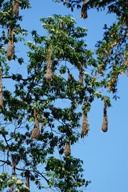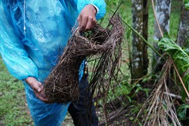 Lindsay takes a nap on the lobby sofa as we wait to see if the rain will let up. When we start our nature walk, Timoteo picks up a fallen weaver’s nest, which is surprisingly dry inside – good construction, birdies!