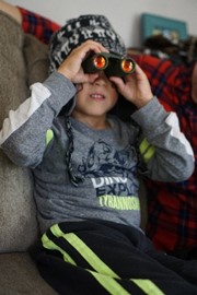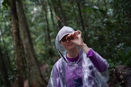 Mattie looking for wildlife with a new pair of binoculars (the best available in Laos!)