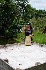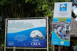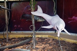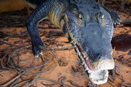 Plastic dummies showing the maximum size of some of the Amazon’s aquatic residents: a Pink River Dolphin and a Black Caiman