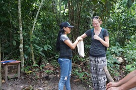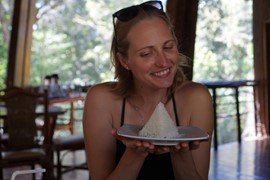 Our guide asks for a volunteer – Lindsay raises her hand because she thinks she’ll get to pet a monkey. Instead, Kelly asks Lindsay to close her eyes and put her hand inside a mystery bag – WTF? What’s in there?!? Turns out to be just a Brazil Nut shell, but Lindsay was freaking out thinking it would be something slimy.