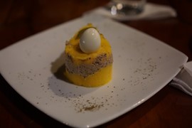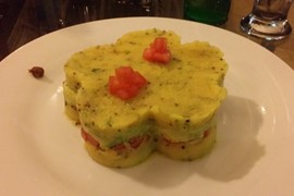 A delicious vegetarian causa dinner and a bottle of Peruvian sparkling wine