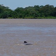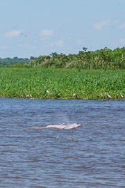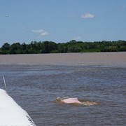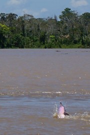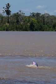 Dolphins! We see a pod of Gray River Dolphins playing where the calm “black water” meets the strong currents of the “brown water,” then we spot a huge PINK River Dolphin