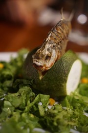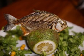 Our guide brought back the one eating-sized piranha he caught for us. The chef cooked it for us as an appetizer. There wasn’t much meat, but what there was tasted pretty good (like flaky white fish). The rest of dinner was just as fancy and tasty as lunch (Lindsay was slowly feeling better and was able to eat half!).
