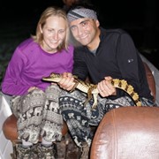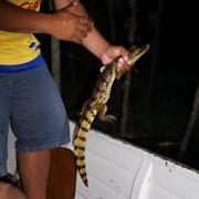 Our guide pulls a Crocodile Dunee-move and grabbs a baby caiman out of the water!