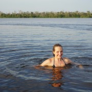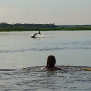 Lindsay swimming with dolphins in the Marañón River in the Amazon Jungle