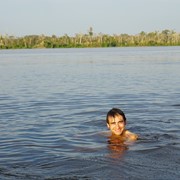 We spend this rest of the morning looking for more animals – we found a troop of Titi Monkeys and some water fowl, but nothing could top holding a sloth. We returned to the lodge for another tasty lunch and headed back on the river in the late afternoon. This time we headed towards the fast-moving water of the main river. Martín and Fernando took us to a cove off the channel where we found dozens of Giant Waterlilies, then back to the fast-moving “brown water” so that we could jump in and swim with the dolphins (don’t worry guys – caiman and piranha only like current-less, “black water”).