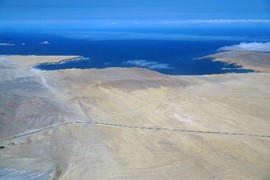 Flying over the resort-town of Paracas – the Pan-American Highway cuts a line through the desert below