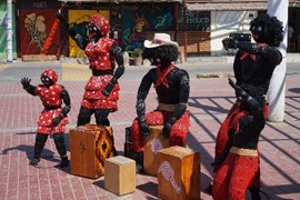 Beach goers and funky art in Paracas