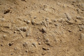 Our guide points out fossilized seashells in the ground on the Fossil Walking Trail
