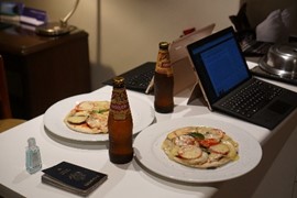 Room service “pizza” and some welcome drinks back at our hotel in Lima