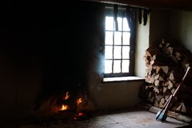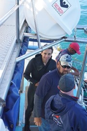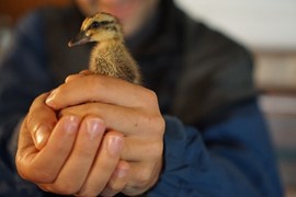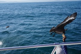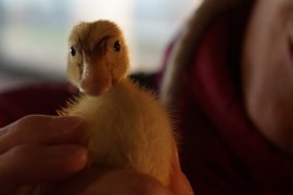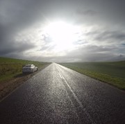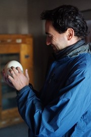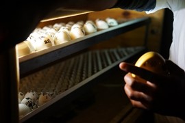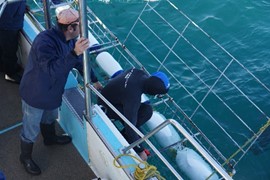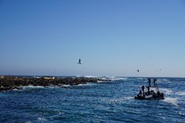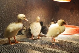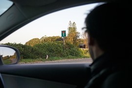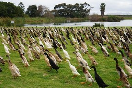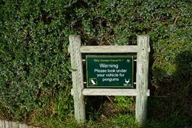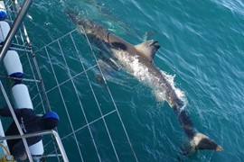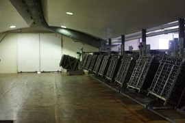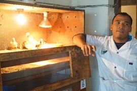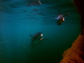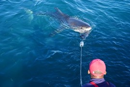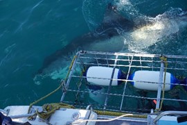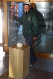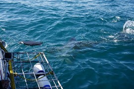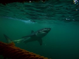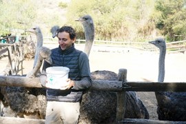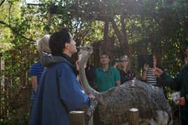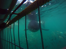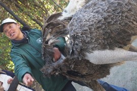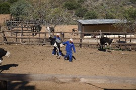 Feeding the lions: a truck drives into the lion cage, where the guy in the passenger seat loops a chain around a pole which drags two chunks of meat off the tailgate as the truck drives off
