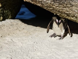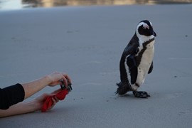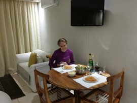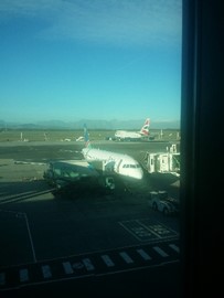 When we packed our bags, we realized our big backpack (with all our clothes, shoes, medication, toiletries and mosquito nets) had gotten a rip near the bottom, and had split open! We tried to duct-tape it shut, but the tear was too large. We considered looking for a camping store in Johannesburg or Pretoria, but didn’t want to risk getting burgled on our last day in the country. Instead, we decided to wrap the backpack at the airport for USD $7. Good news was the wrapping was very thorough – nothing would fall out with all that cellophane! Bad news was there was no way to wrap the bag without losing access to the shoulder straps, so we have to carry around our 17kg bag like a baby around the airport. We quickly snished our remaining errands (exchanging money, mailing postcards and finding a pharmacy) before checking in to our Air Kenya flight.